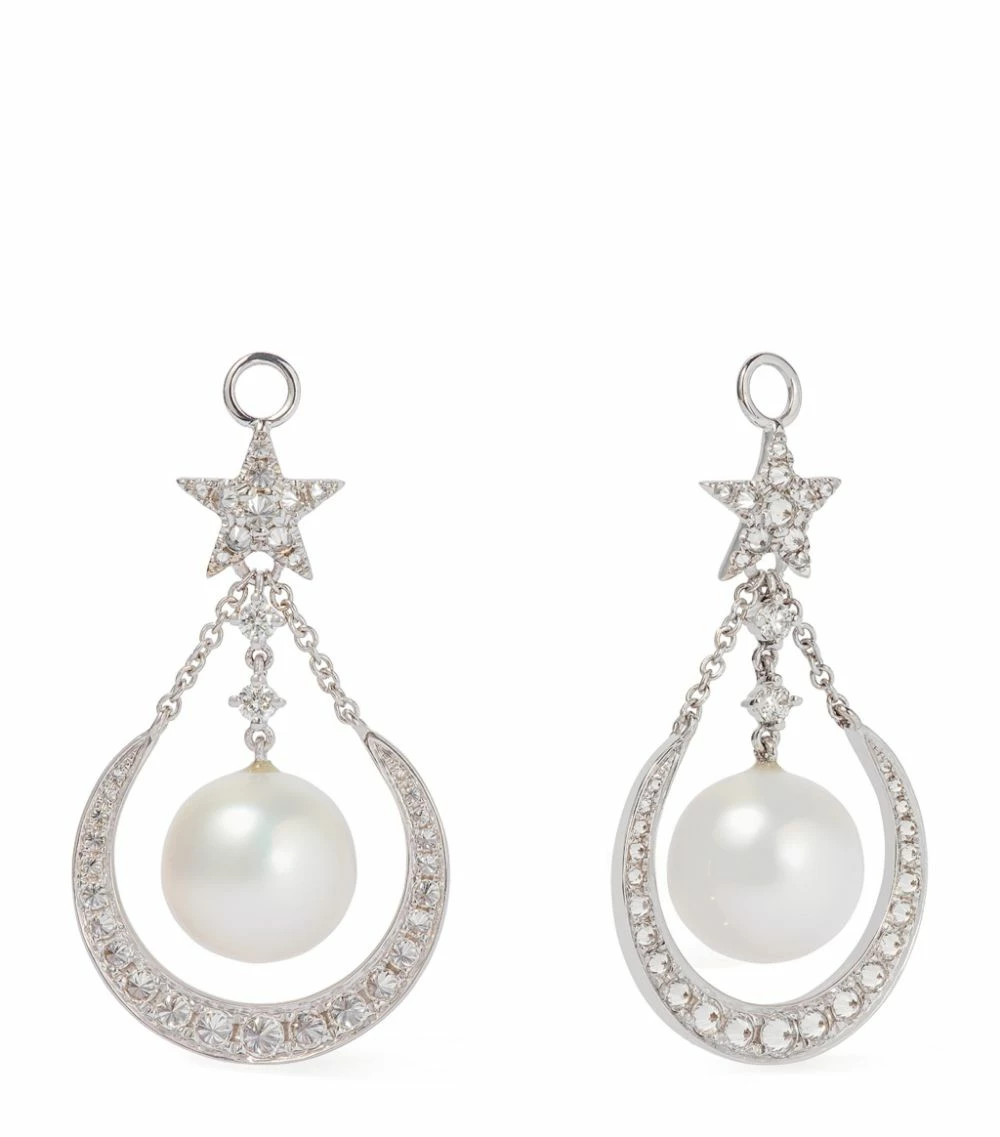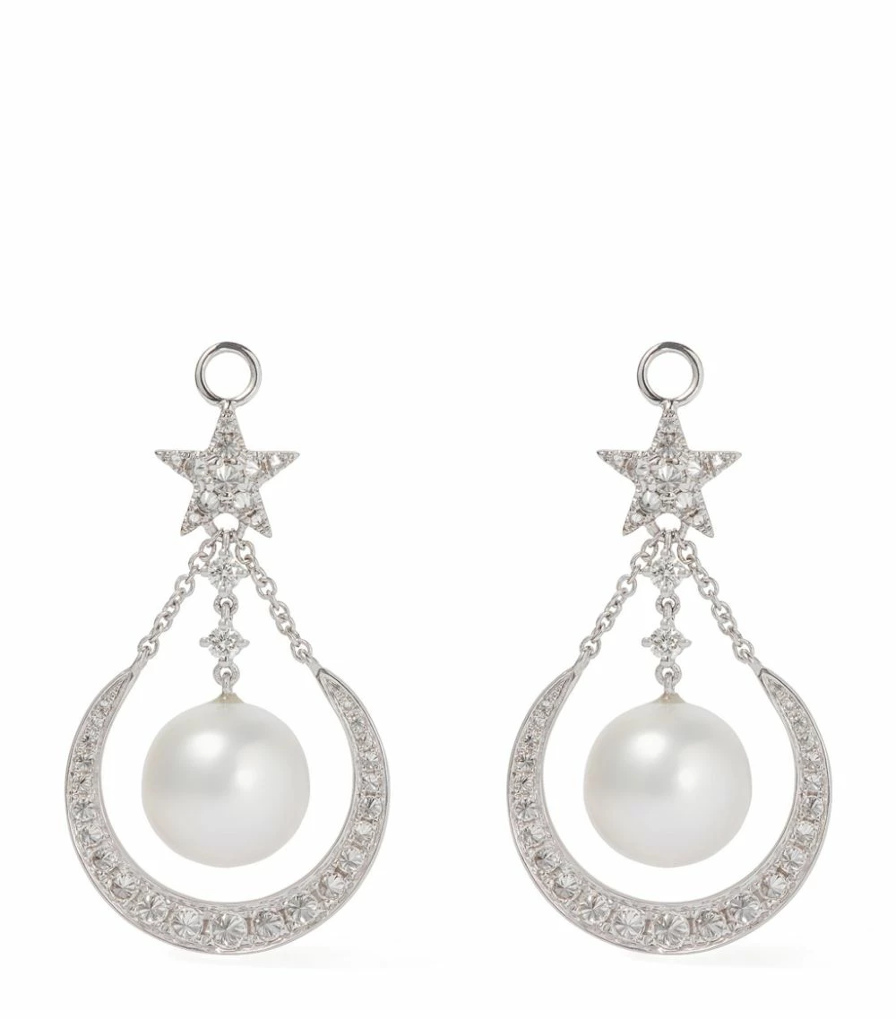 London-based jeweller Annoushka continues to present modern ways to wear pearls with the exquisite Diamonds & Pearls collection. Inspired by an ancient starlit night sky, these interchangeable 18-karat white gold earrings see a diamond-dotted crescent moon dangle beneath a star motif and a freshwater pearl.