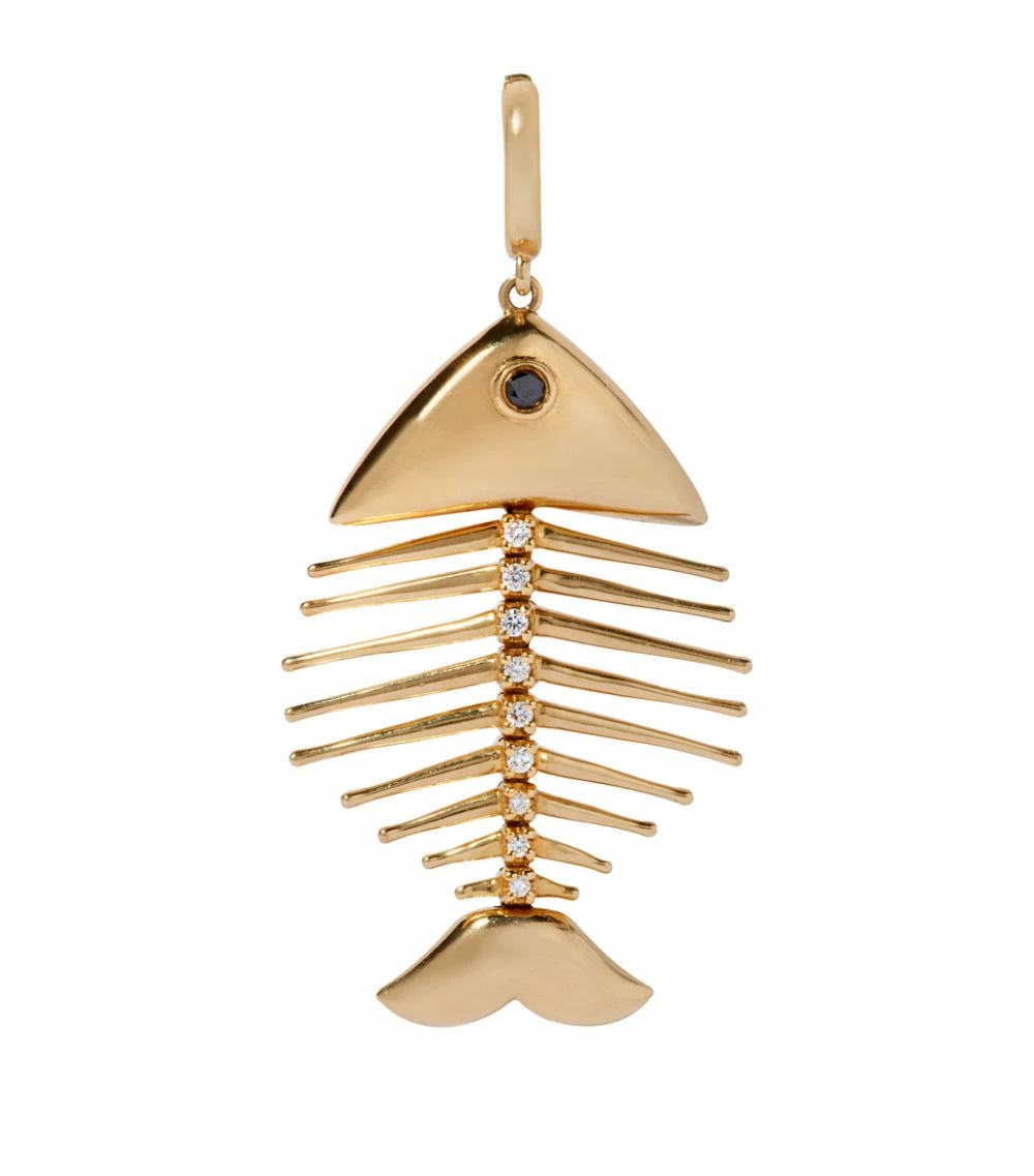 Part of the My Life in Seven Charms bespoke collection which is made up of miniature symbols of key aspects in the designer’s life, this fish bones charm signifies the start of founder Annoushka Ducas’ career as a jeweller when she designed fish cufflinks for her mother’s business. Encrusted with a row of glistening white diamonds to the spine and accented with a single black diamond to the eye, the petite 18-karat yellow gold charm – which sees the golden bones swing and sway – is fitted with a clasp that easily clips onto the label’s line of necklaces and bracelets, either on its own or mix and matched with other charms for a personalised curation.